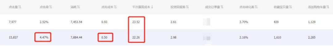 这里也向大家展示2组案例,在同样时段里,2个不同CTR的计划的CPC效果对比:在CPM非常接近的情况下,越高的点击率最终的点击成本效果也越低。